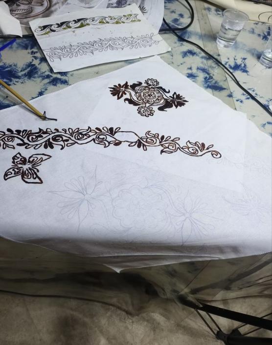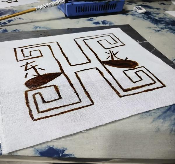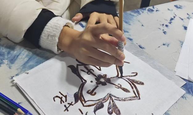 原以为枫香染不过是简单的“画画+染色”,真正上手才知其中门道。韦丽老师告诉我们,这门技艺的核心在于“以油防染”,从枫香油的提取提纯、与牛油的比例调配,到画油、染布、煮布、漂洗、晾晒,每一个环节都容不得半点马虎。光是“烧油”这一步,我们就练了整整两天——火温太高会让油脂变质,太低则无法达到防染效果,看着老师熟练掌控火候的模样,才懂“三顾茅庐拜师、三年严格考核”背后的坚守。我第一次执笔蘸油作画时,手腕僵硬得不听使唤,线条歪歪扭扭,韦丽老师没有直接纠正,而是握着我的手,带着我感受布依族图腾里的山川草木,“画画前要先读懂图案背后的故事,才能让线条有灵气”。